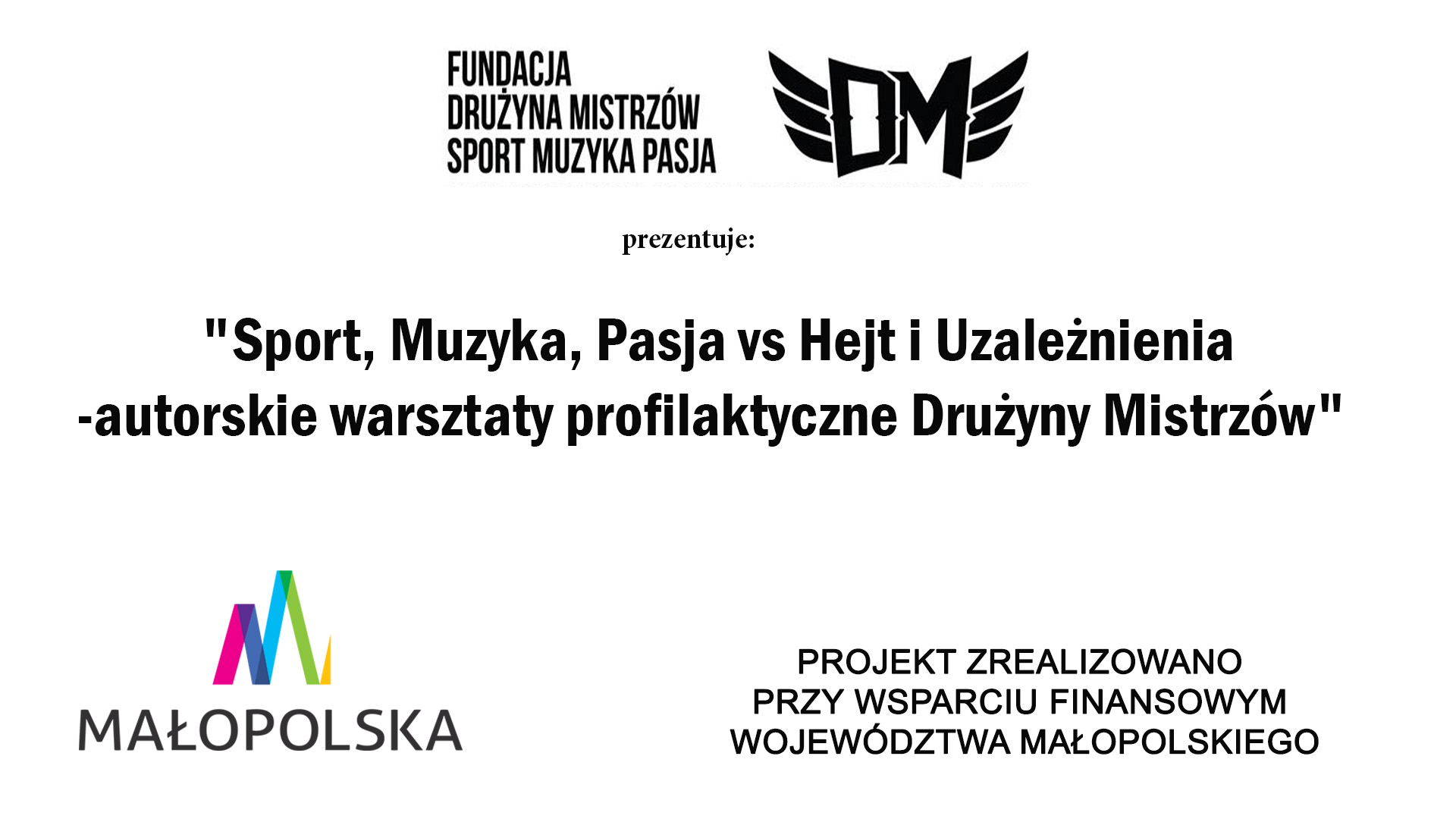 Sport, Muzyka, Pasja vs Hejt i Uzależnienia„W kwietniu 2026 roku nasza fundacja zrealizowała program „Sport, Muzyka, Pasja vs Hejt i Uzależnienia” – autorskie warsztaty profilaktyczne Drużyny Mistrzów, które zostały zrealizowane dzięki wsparciu finansowemu i we współpracy z Urzędem Marszałkowskim Województwa Małopolskiego. Odwiedziliśmy XXX Liceum Ogólnokształcące w Krakowie oraz Dom Kultury w Łapanowie, w którym w ramach dwóch tur warsztatów uczestniczyli