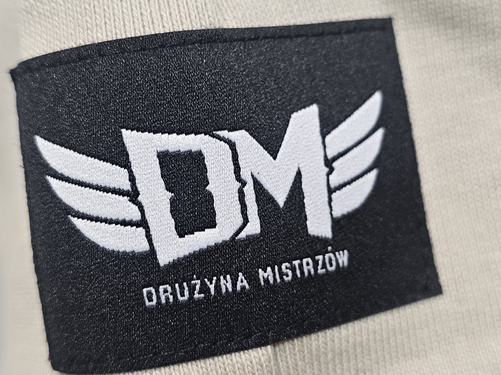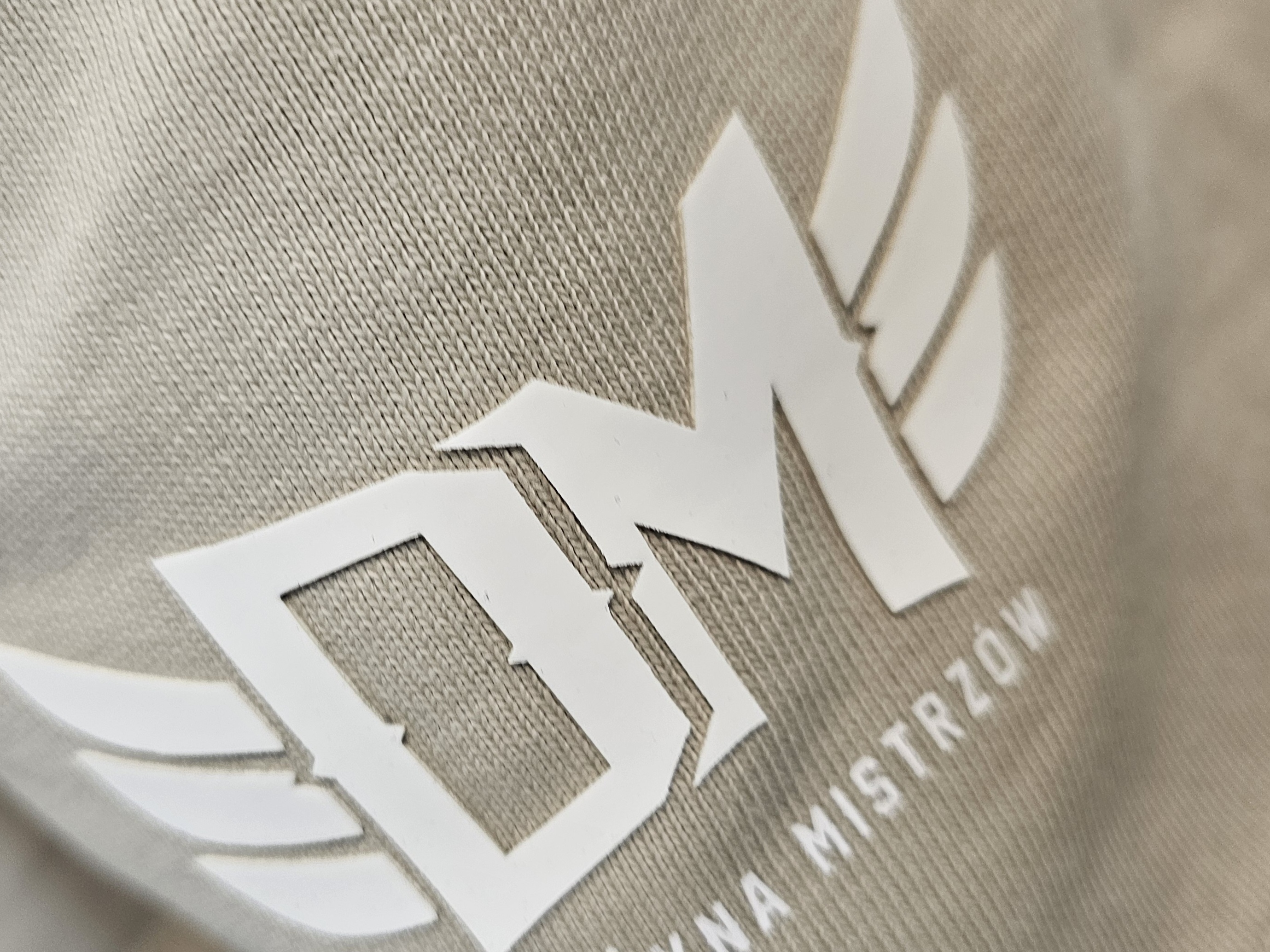 Design „Drużyna Mistrzów”: Wyraziste, białe logo „DM” z motywem skrzydeł na lewej nogawce nadaje spodniom unikalnego, motywacyjnego charakteru.
