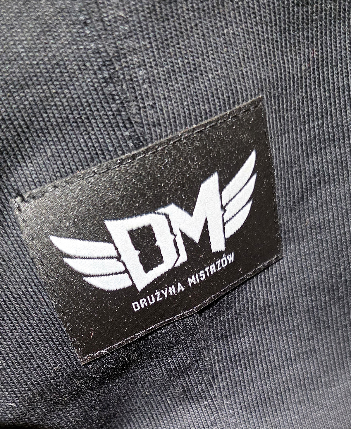 Na prawej nogawce, na linii szwów, wszyta żakardowa metka DM.