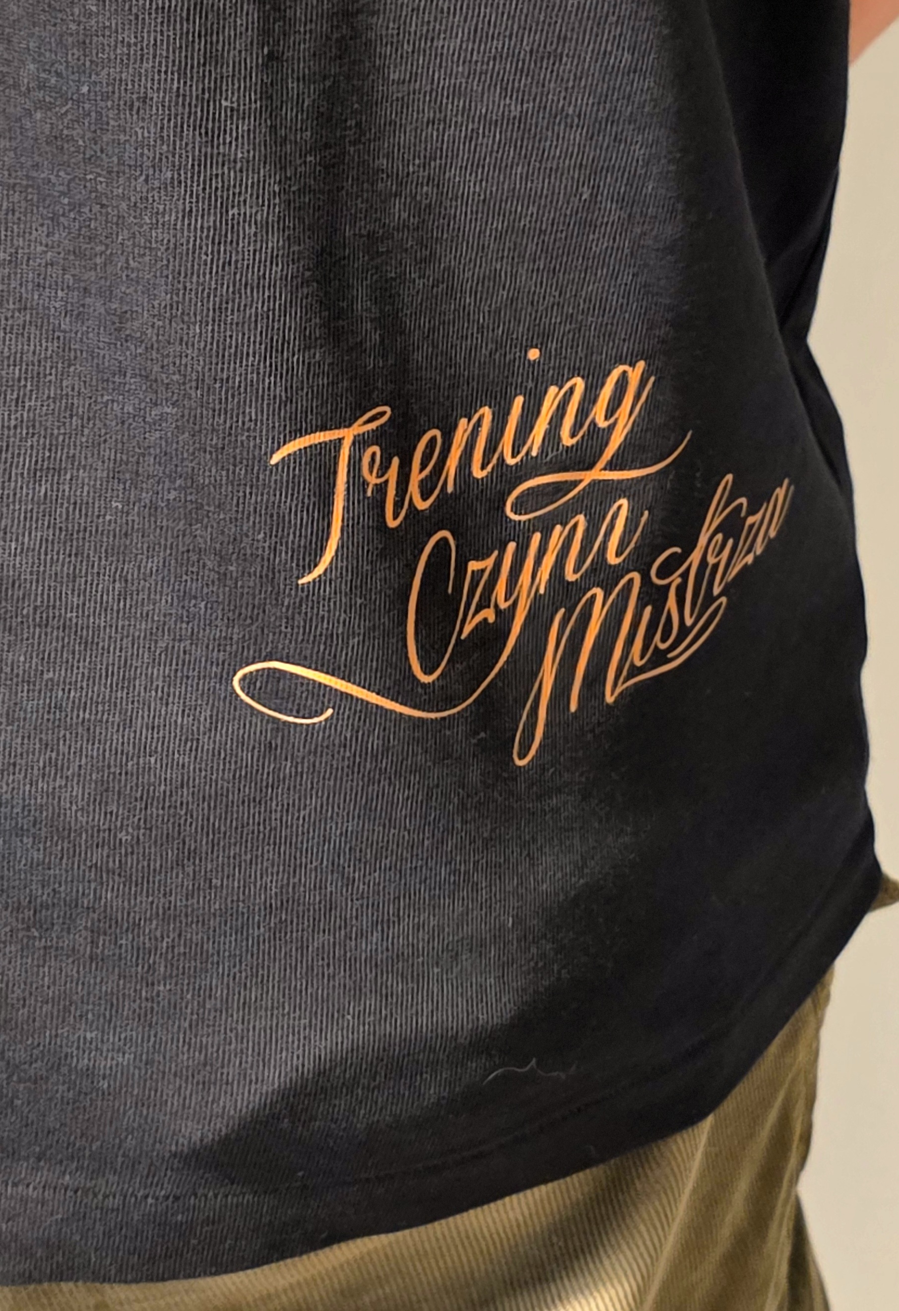 Duże logo DM na froncie w technice transferowej. Logo kaligrafia Trening Czyni Mistrza na prawej nerce w technice transferowej.