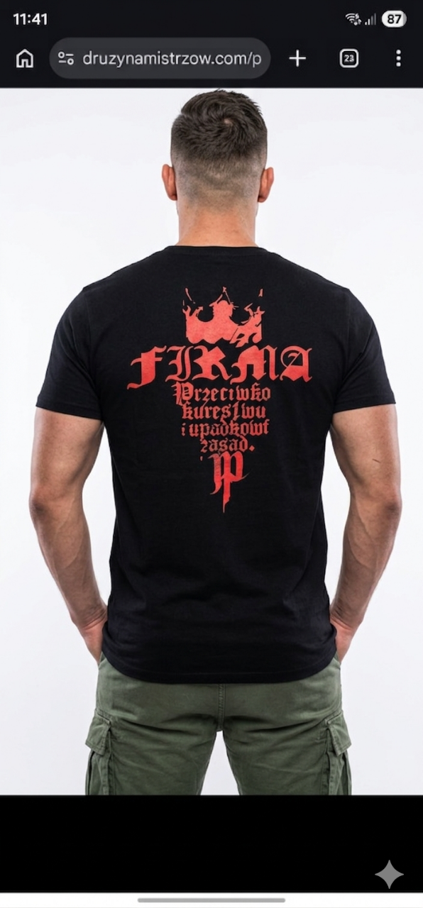 ​Design: Głęboka czerń przełamana charakterystycznym, czerwonym logotypem „FIRMA” wykonanym w gotyckim stylu. Dodatkowy detal na rękawie podkreśla unikalny charakter odzieży.